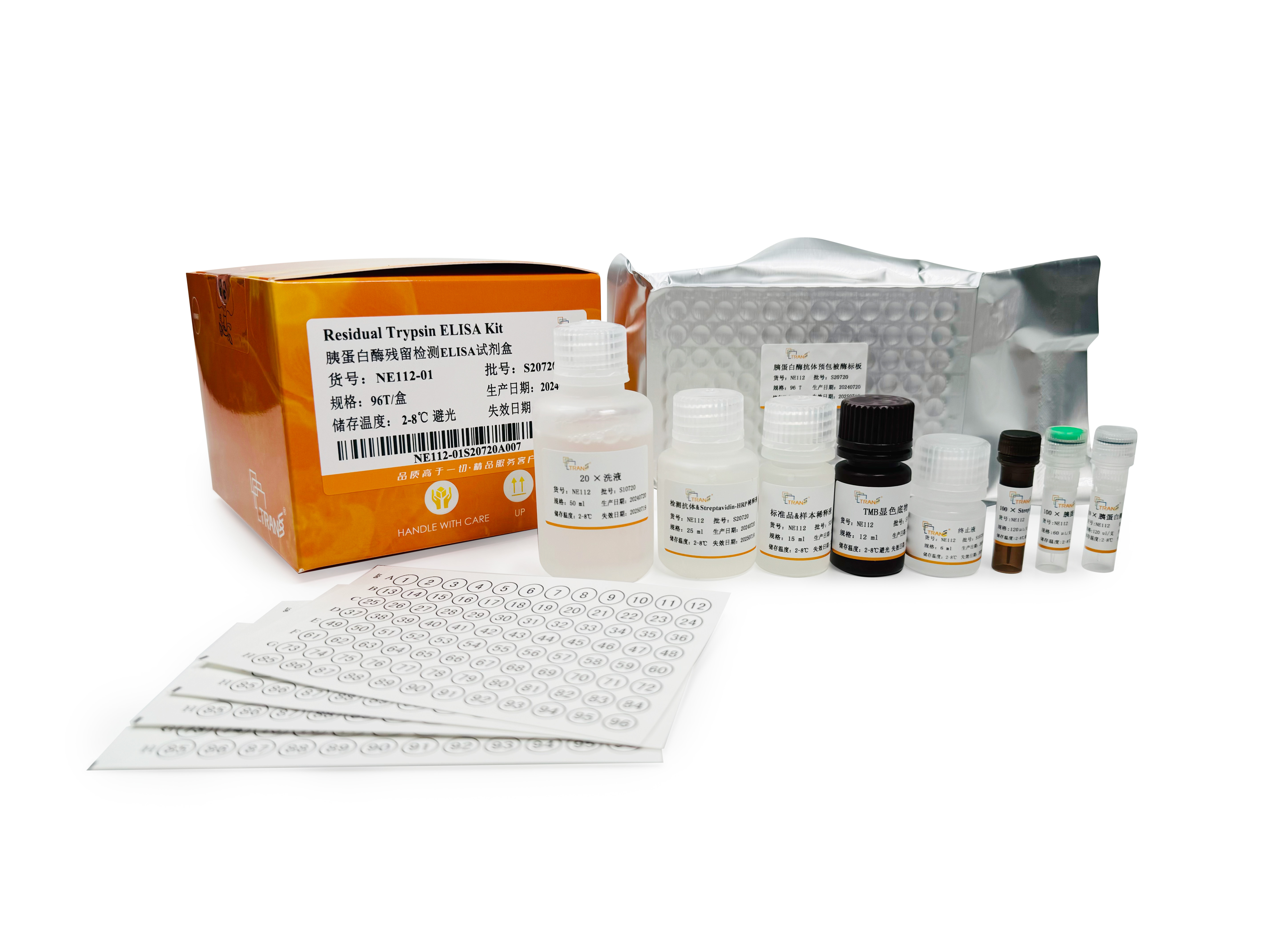 胰蛋白酶(Trypsin)是一種絲氨酸蛋白酶,可特異性切割賴氨酸及精氨酸C末端肽鍵。胰蛋白酶常用于多種生物制品的生產(chǎn)工藝中,例如重組胰島素的生產(chǎn),重組蛋白藥物或融合表達(dá)工藝中的酶切,疫苗和干細(xì)胞生產(chǎn)工藝中細(xì)胞的處理。本試劑盒采用雙抗體夾心ELISA法,可用于生物制品中重組以及天然(豬胰腺)來源豬胰蛋白酶的微量殘留檢測。本試劑盒采用高親和力的抗豬胰蛋白酶抗體預(yù)包被酶標(biāo)板,將標(biāo)準(zhǔn)品/待測樣本和生物素標(biāo)記的抗豬胰蛋白酶檢測抗體同步加入微板孔中,經(jīng)過孵育后樣本中存在的胰蛋白酶會與酶標(biāo)板上的預(yù)包被抗體及檢測抗體特異性結(jié)合。洗滌去除未結(jié)合物后,將辣根過氧化物酶標(biāo)記的鏈霉親和素(Streptavidin-HRP)加至微孔板中并孵育,通過檢測抗體上的生物素和鏈霉親和素發(fā)生的高強(qiáng)度非共價結(jié)合,形成“包被抗體-胰蛋白酶-檢測抗體-Streptavidin-HRP”免疫復(fù)合物。再次洗滌后,將顯色底物TMB加至微板孔中,HRP會催化TMB底物生成藍(lán)色產(chǎn)物,顏色反應(yīng)的深淺將與樣本中胰蛋白酶的濃度成正相關(guān)。而后加入終止液終止反應(yīng),在450 nm波長(參考波長570-630 nm)處測定吸光度值。通過繪制標(biāo)準(zhǔn)曲線,由樣本吸光度值可計算出樣本中所含胰蛋白酶濃度。本試劑盒特異性強(qiáng)、檢測靈敏度高,同時操作更加便捷。
