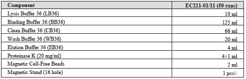 本試劑盒采用酶解法裂解樣品,利用硅基磁珠特異吸附,有效純化游離DNA。適用于從0.5-10 ml血清或血漿中分離純化高質(zhì)量游離DNA。提取的DNA適用于PCR、qPCR、NGS等實(shí)驗(yàn)。本試劑盒適用于磁棒式高通量核酸提取儀。