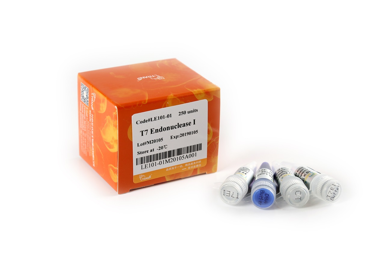 本產(chǎn)品由重組T7 Endonuclease I(T7EI)基因的載體,在大腸桿菌中經(jīng)誘導(dǎo)表達(dá)、純化而成。T7EI識(shí)別并切割不完全配對(duì)、含十字形結(jié)構(gòu)、Holliday結(jié)構(gòu)、異源雙鏈的DNA以及隨機(jī)切割單鏈DNA。該酶切割位點(diǎn)在錯(cuò)配堿基5'端的第一、第二或第三個(gè)磷酸二酯鍵。