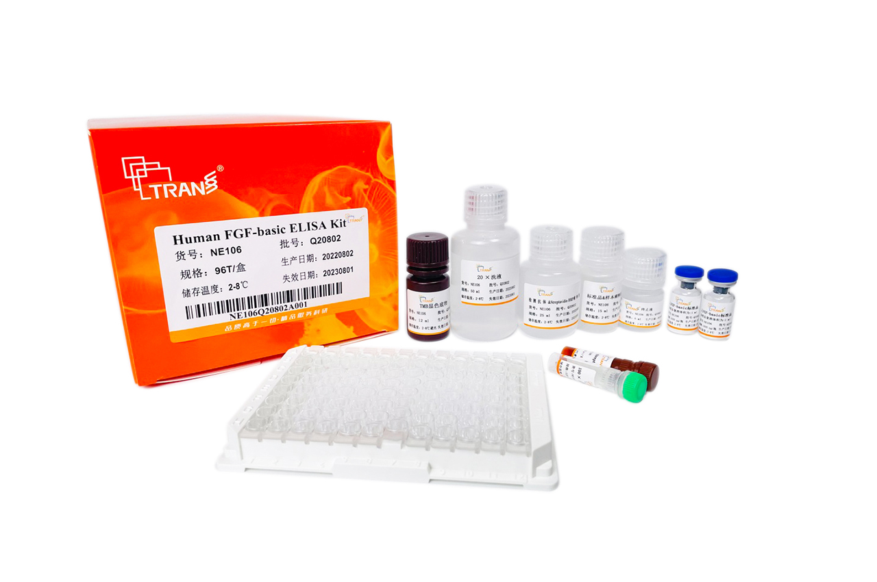 本試劑盒采用雙抗體夾心ELISA法定量測(cè)定人血清、血漿和細(xì)胞培養(yǎng)上清中的FGF basic含量。本試劑盒采用高親和力的抗人FGF basic抗體預(yù)包被酶標(biāo)板,將標(biāo)準(zhǔn)品/待測(cè)樣本加入微板孔中,經(jīng)過(guò)孵育后樣本中存在的FGF basic會(huì)與酶標(biāo)板上的預(yù)包被抗體特異性結(jié)合。洗滌去除未結(jié)合物后,將生物素標(biāo)記的抗人FGF basic檢測(cè)抗體加入微板孔中,再次孵育后檢測(cè)抗體會(huì)與錨定在酶標(biāo)板上的FGF basic特異性結(jié)合。隨后,將辣根過(guò)氧化物酶標(biāo)記的鏈霉親和素(Streptavidin-HRP)加至微孔板中并孵育,通過(guò)檢測(cè)抗體上的生物素和鏈霉親和素發(fā)生的高強(qiáng)度非共價(jià)結(jié)合,形成“包被抗體-人FGF basic蛋白-檢測(cè)抗體-Streptavidin-HRP”免疫復(fù)合物。再次洗滌后,將顯色底物TMB加至微板孔中,HRP會(huì)催化TMB底物生成藍(lán)色產(chǎn)物,顏色反應(yīng)的深淺將與樣本中FGF basic的濃度成正相關(guān)。而后加入終止液終止反應(yīng),在450 nm波長(zhǎng)(參考波長(zhǎng)570 - 630 nm)處測(cè)定吸光度值。通過(guò)繪制標(biāo)準(zhǔn)曲線,由樣本吸光度值可計(jì)算出樣本中所含F(xiàn)GF basic濃度。本試劑盒特異性強(qiáng)、檢測(cè)靈敏度高,同時(shí)操作更加便捷。