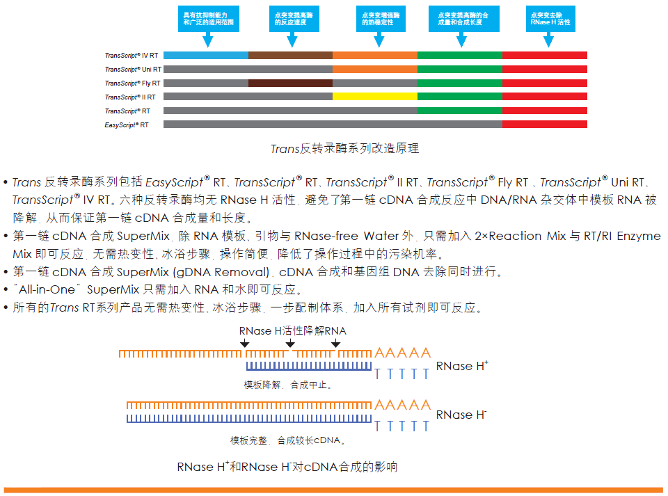EasyScript? One-Step RT-PCR SuperMix是具有高效合成能力和高擴(kuò)增效率的一步法RT-PCR試劑盒。本試劑盒以RNA為模板,反向基因特異引物為反轉(zhuǎn)錄引物合成第一鏈cDNA;然后以合成的cDNA為模板,用正向、反向基因特異引物進(jìn)行PCR,在同一反應(yīng)體系中一步完成從反轉(zhuǎn)錄到PCR的全部反應(yīng)。擴(kuò)增產(chǎn)物可直接點(diǎn)樣電泳。