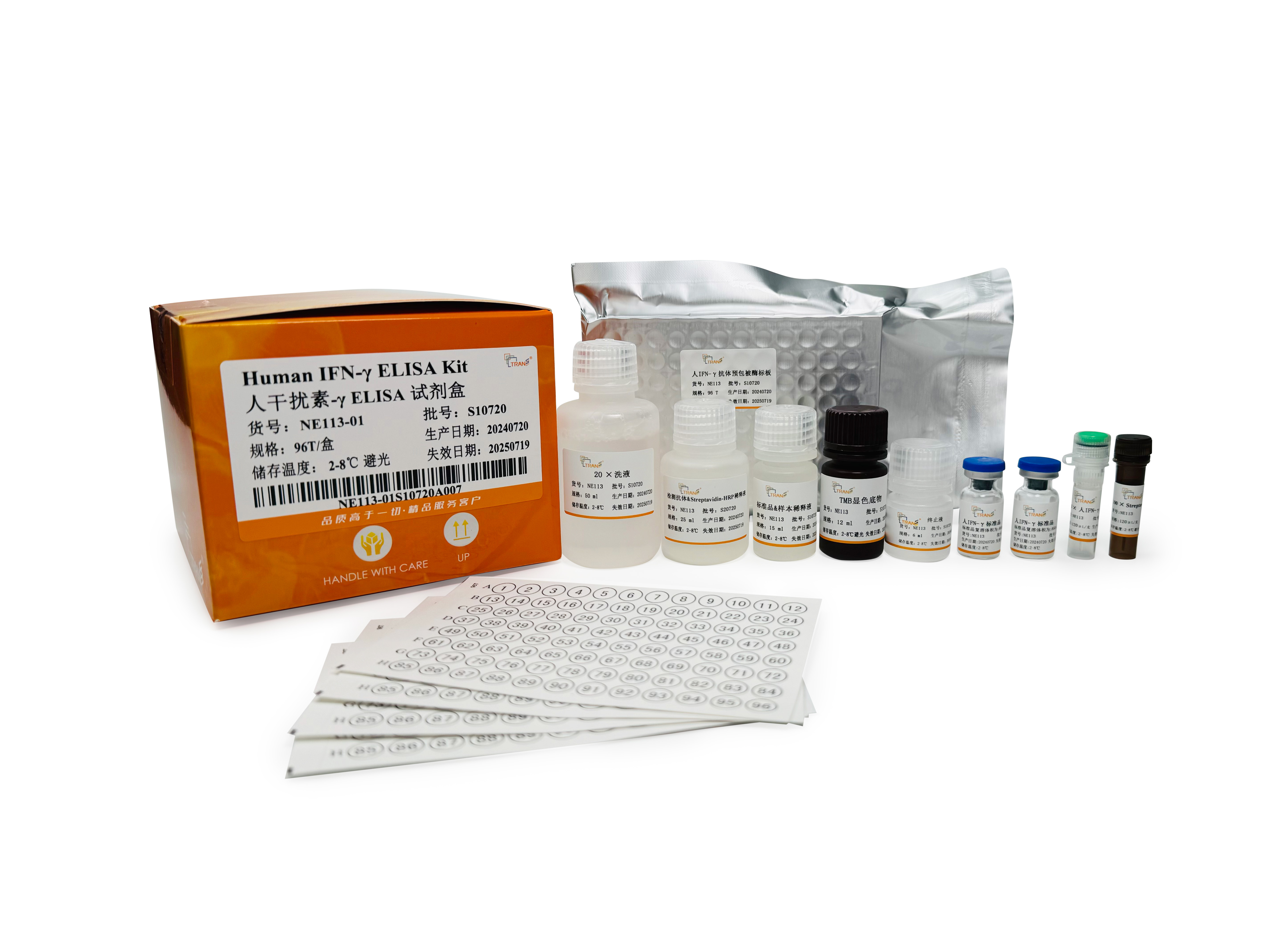 本試劑盒采用雙抗體夾心ELISA法定量測定人血清、血漿和細胞培養(yǎng)上清中的IFN-γ含量。本試劑盒采用高親和力的抗人IFN-γ抗體預包被酶標板,將標準品/待測樣本和生物素標記的抗人IFN-γ檢測抗體同步加入微板孔中,經(jīng)過孵育后樣本中存在的IFN-γ會與酶標板上的預包被抗體和檢測抗體特異性結(jié)合。洗滌去除未結(jié)合物后,將辣根過氧化物酶標記的鏈霉親和素(Streptavidin-HRP)加至微孔板中并孵育,通過檢測抗體上的生物素和鏈霉親和素發(fā)生的高強度非共價結(jié)合,形成“包被抗體-人IFN-γ蛋白-檢測抗體-Streptavidin-HRP”免疫復合物。再次洗滌后,將顯色底物TMB加至微板孔中,HRP會催化TMB底物生成藍色產(chǎn)物,顏色反應的深淺將與樣本中IFN-γ的濃度成正相關。而后加入終止液終止反應,在450 nm波長(參考波長570 - 630 nm)處測定吸光度值。通過繪制標準曲線,由樣本吸光度值可計算出樣本中所含IFN-γ濃度。本試劑盒特異性強、檢測靈敏度高,同時操作更加便捷。