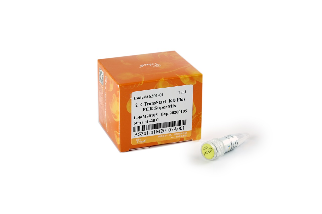 本產(chǎn)品含TransStart? KD Plus DNA Polymerase、dNTPs和優(yōu)化的反應緩沖液,濃度為,擴增能力強,擴增速度快,具有超高保真性、高特異性。DNA擴增時,只需加入模板、引物和水,使SuperMix溶液的濃度為即可進行反應。擴增產(chǎn)物為平端,可直接克隆于pEASY?-Blunt系列載體中。