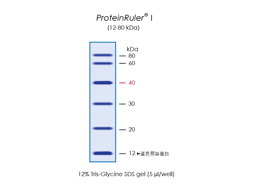 ProteinRuler? I由6種重組蛋白質(zhì)組成,分子量范圍為12 kDa-80 kDa。經(jīng)SDS-PAGE電泳后,用考馬斯亮藍染色可見清晰的6條帶。12 kDa為藍色預(yù)染蛋白,便于動態(tài)觀察蛋白質(zhì)電泳狀態(tài)。40 kDa為加亮條帶,便于分子量鑒定。