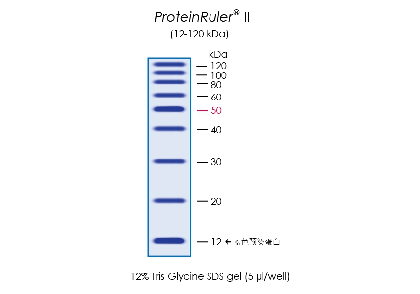 ProteinRuler? II由9種重組蛋白質(zhì)組成,分子量范圍為12 kDa-120 kDa。經(jīng)SDS-PAGE電泳后,用考馬斯亮藍(lán)染色可見清晰的9條帶。12 kDa為藍(lán)色預(yù)染蛋白,便于動態(tài)觀察蛋白質(zhì)電泳狀態(tài)。50 kDa為加亮條帶,便于分子量鑒定。
